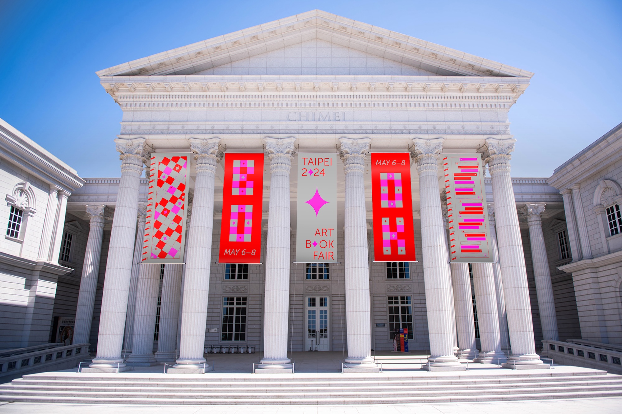 A poster series and identity design for the Taipei Art Book Fair, held at the Taipei Fine Art Museum, features a dynamic and playful design with motion graphics that uses vibrant colors and geometric patterns. The composition of the poster was inspired by a spiral-binded fairytale with the title of the book fair replacing the title of the book. The poster series and the book fair identity is divided into two primary sections. The first half showcases art books in bookshelves, interspersed with playful star icons that add a sense of art fairytale. This arrangement suggests the rhythm and vibrancy of the artistic books and fairytales celebrated at the fair. The second half features a checkerboard pattern with alternating red and magenta squares, overlaid with dashed lines and additional star elements, reinforcing the identity of playful exploration. By developing an interactive website, people could create their own poster by dragging elements onto a poster mockup to engage with the identity and celebrate art and literature.
