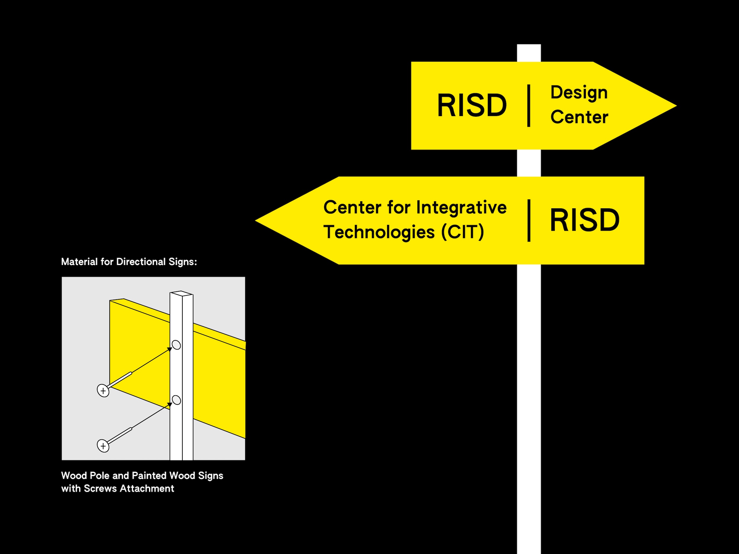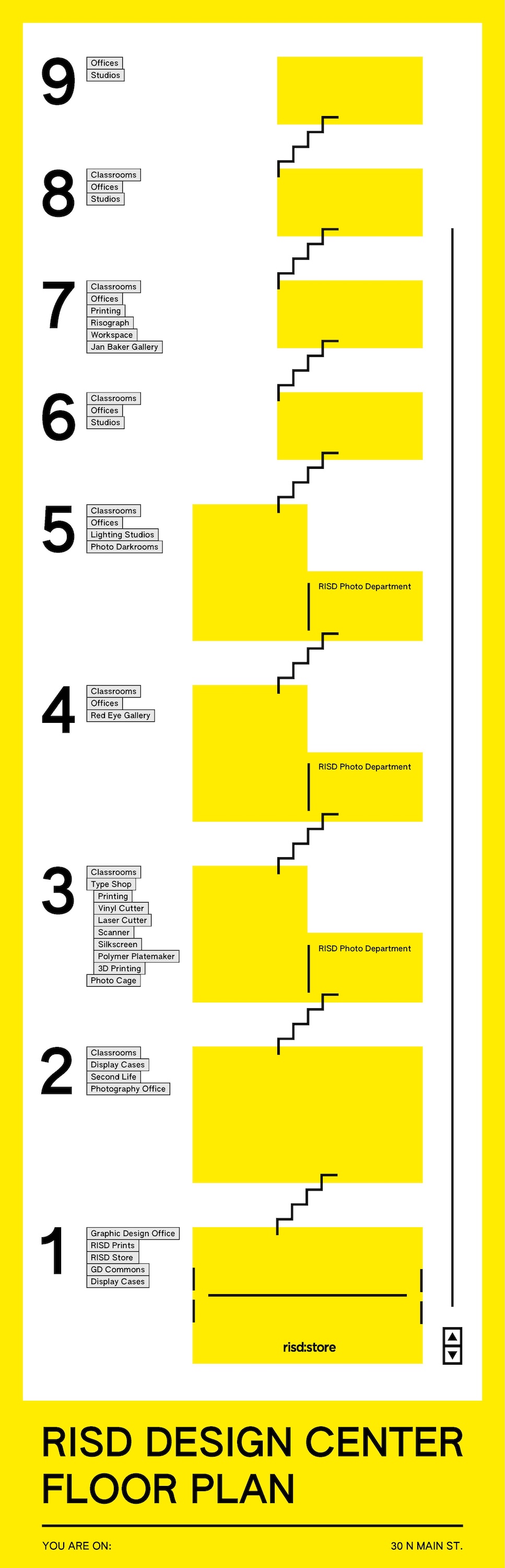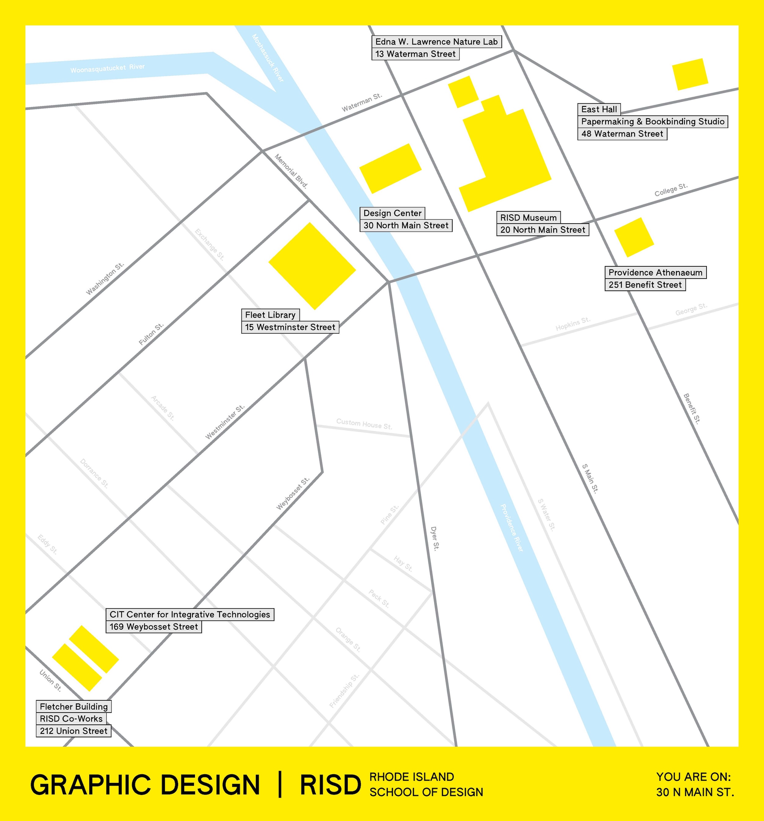 This project is a custom-designed wayfinding system for the Graphic Design building at Rhode Island School of Design, helping both undergraduate and graduate students, and visiting guests and critics to find their way to designated locations. The design includes a full building map of the Design Center from floor 1 through 9. It also includes the contexts of a broader map of RISD Campus in Providence to highlight each building’s placement within the city. The street wayfinding signs were designed to be installed outdoors, guiding pedestrians from nearby intersections to the correct entrances. All maps and signs were scaled with human-size ratio references to ensure legibility in real-world conditions.